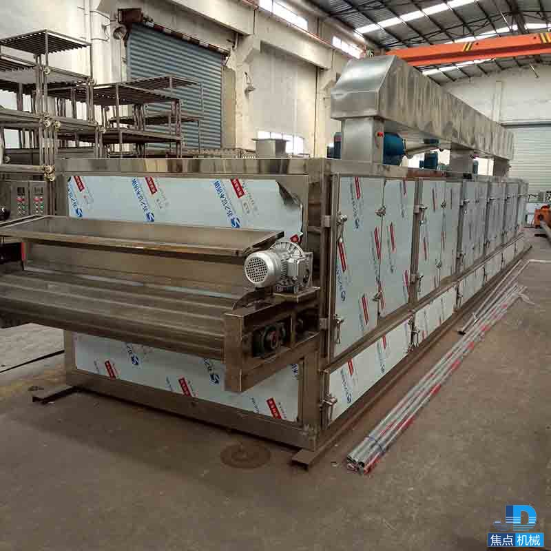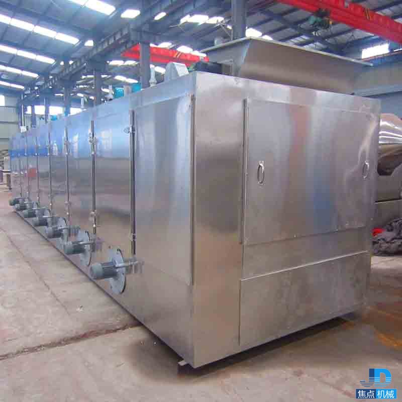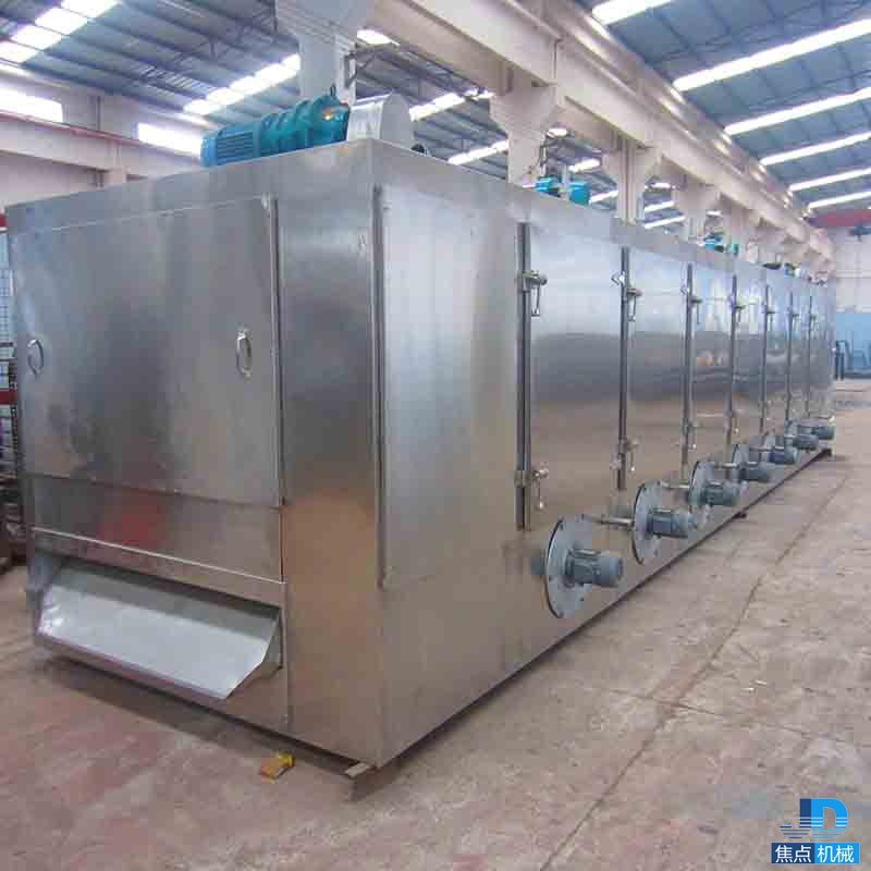 物料由加料器均勻地鋪在網(wǎng)帶上,網(wǎng)帶一般采用12-60目不銹鋼絲網(wǎng),由傳動裝置拖動在干燥機內(nèi)移動。干燥機由若干單元組成,每一單元熱風獨立循環(huán),部分尾氣由專門排濕風機排出,廢氣由調(diào)節(jié)閥控制,熱氣由下往上或由上往下穿過鋪滿物料的網(wǎng)帶完成熱量與質(zhì)量傳遞的進程,帶走物料水份。網(wǎng)帶緩慢移動,運行速度可根據(jù)物料溫度自由調(diào)節(jié),干燥后的成品連續(xù)落入收料器中。上下循環(huán)單元根據(jù)用戶需要可靈活配備,單元數(shù)量亦可根據(jù)需要選取。